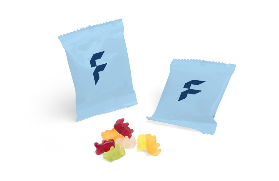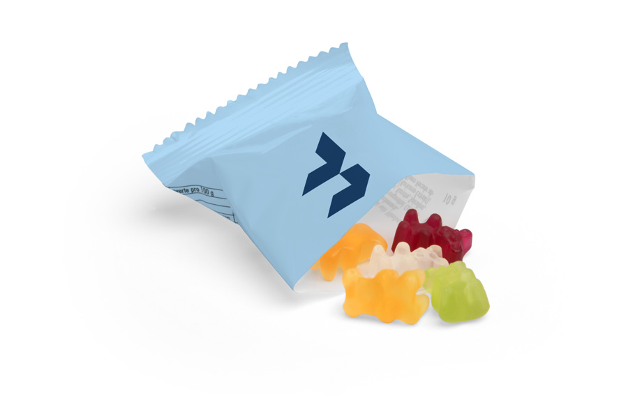 Naschen erlaubt – auch im Büro! Die zuckerfreien Gummibärchen sind der perfekte Werbeartikel für alle, die weniger Zucker essen möchten. Statt klassischem Zucker kommt hier Maltitsirup zum Einsatz. Der schmeckt genauso süß, enthält aber weniger Kalorien. Ob auf Messen, im Wartezimmer oder als Beilage zu Bestellungen – bedruckt mit Ihrem Logo kommen die kleinen Fruchtgummis immer gut an.