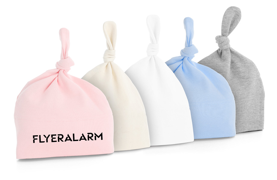 Halten das Babyköpfchen warm und die Augen der Menschen drumherum auf Ihr Logo gerichtet: Knotenmützen für Babys sind ein einfacher und ungemein sympathischer Weg, Ihre Zielgruppe subtil zu erreichen und an sich zu binden. Bedrucken Sie die süßen Mützchen vorderseitig im fotorealistischen Digitaltransferdruck, verschenken Sie sie an die werdenden oder frisch gebackenen Eltern Ihrer Klientel oder Belegschaft und sichern Sie sich zusätzliche Sympathiepunkte.