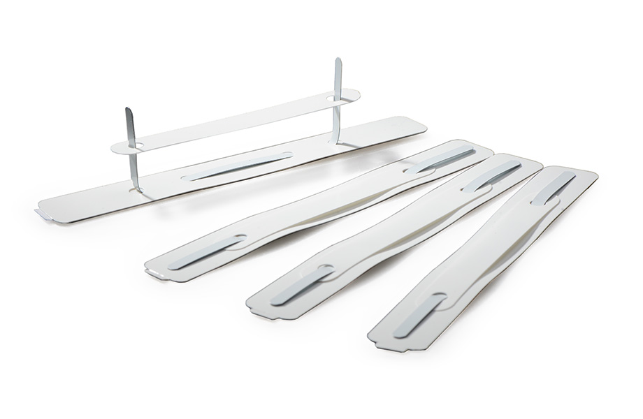 weiß, Rückseite selbstklebend, Bestandteile: Basisteil Grundplatte (150 x 16 mm, Hart-PVC 300 µm, selbstklebend ausgerüstet), Schnellhefterzunge (148 x 5 mm, Stahl, weiß lackiert), Kunststoffdeckleiste (95 x 12 mm, Hart-PVC 300 µm, montiert geliefert), Abstand Lochmitte bis Lochmitte 8 cm, Produktmaße: 15 cm x 1,6 cm