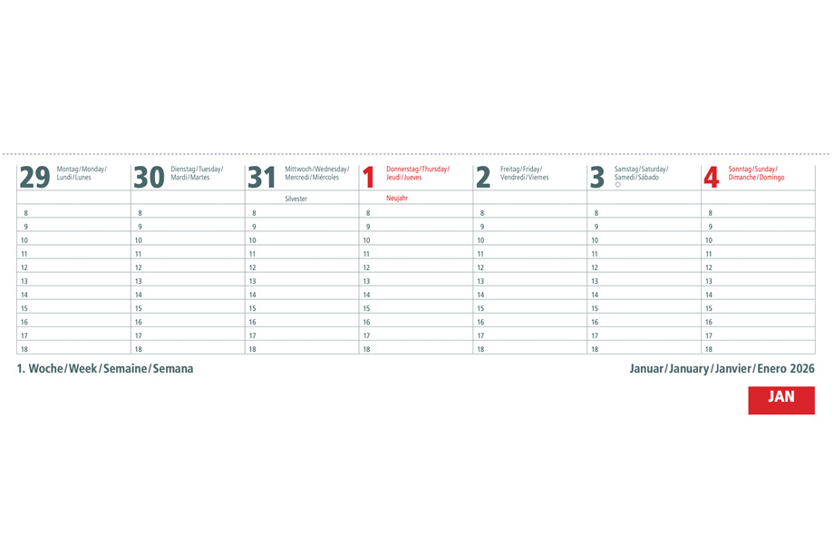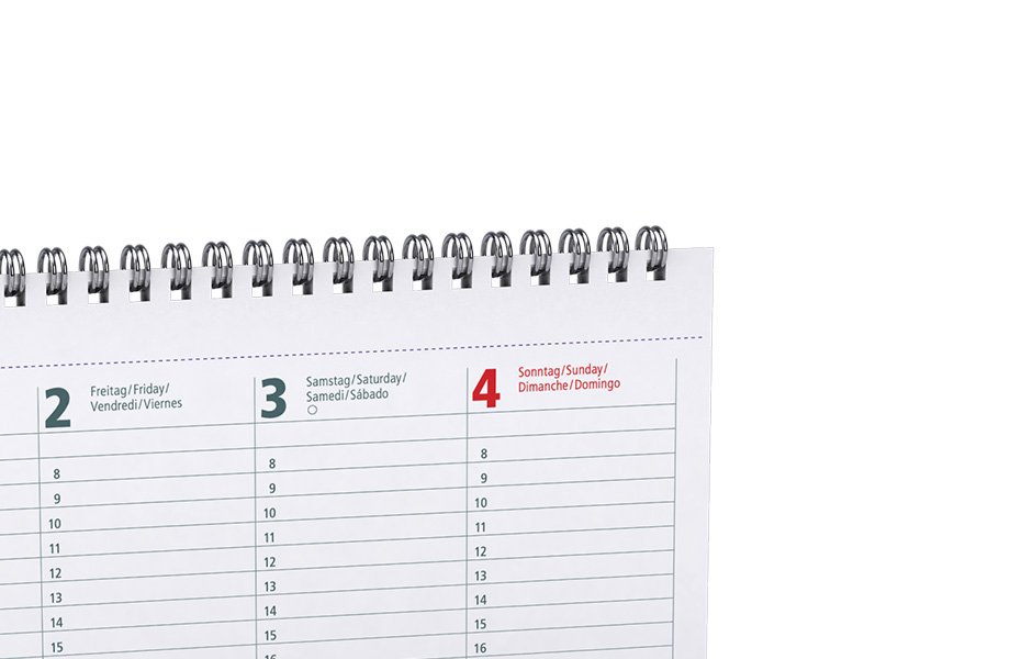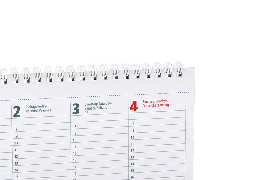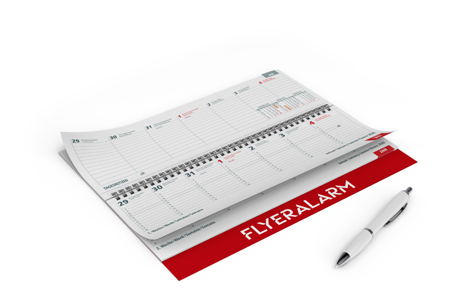 Deckblatt: 29,7 x 10,2 cm, 4/0-farbig, individuell bedruckbar, Rückblatt: 29,7 x 13 cm, Rückblatt hat das Material des gewählten Deckblattes, 4/0-farbig, individuell bedruckbar, permanent sichtbare Werbefläche: 29,7 x 3 cm, Kalendarium 2026 vorgedruckt, 4-sprachig DE/EN/FR/ES, 29,7 x 10 cm, 70 g Offset weiß, 56 Blatt, Standardmotiv, 2/2-farbig, 2 Seiten pro Woche