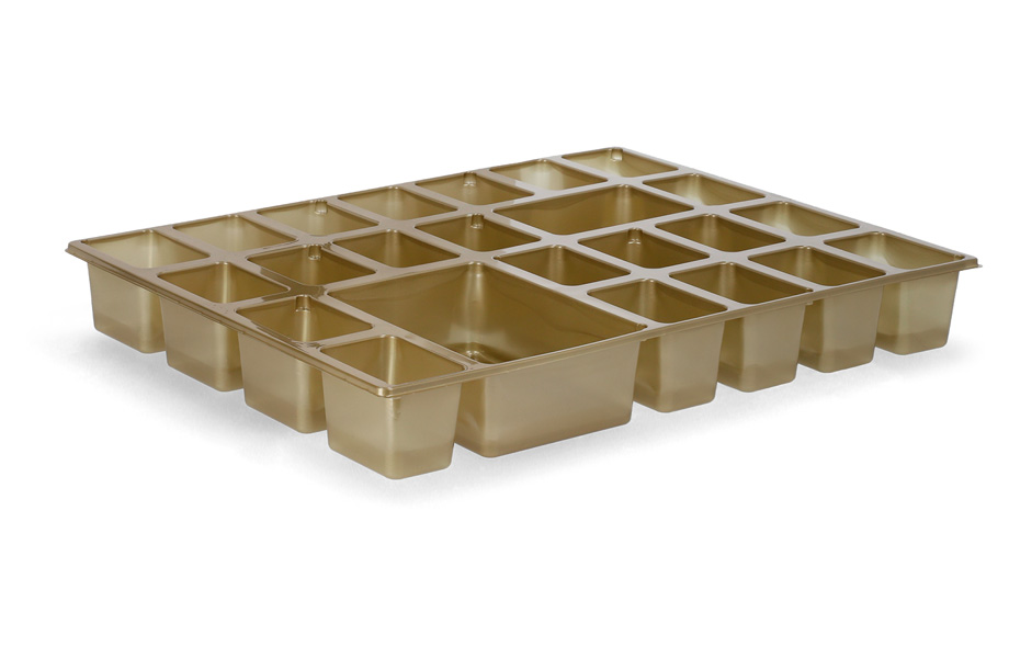 - Materialien: außen 350 g Chromo-Sulfatkarton, innen 0,450 mm A-PET Kunststoff in Gold
