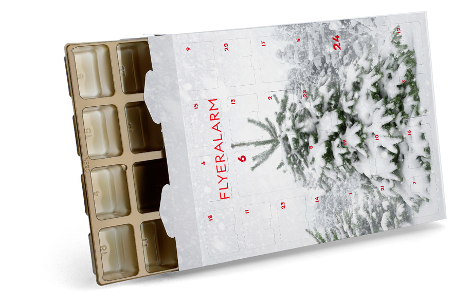 Sorgen Sie für eine Vorweihnachtszeit, die Ihnen einen festen Platz im Gedächtnis Ihrer Kunden und Partner sichert: mit hauseigenen Adventskalendern, die Sie jetzt individuell bestücken und bedrucken können. Die vorgestanzten Adventskalender bieten 24 großzügig bemessene Fächer, in welchen süße Leckereien mit eigenem Brand ebenso verstaut werden können wie kleine, firmentypische Aufmerksamkeiten aller Art. Lassen Sie Ihrer Kreativität freien Lauf, branden Sie den Adventskalender zum Befüllen mit Ihrem Logo und beeindrucken Sie auf ganz persönliche Weise.
