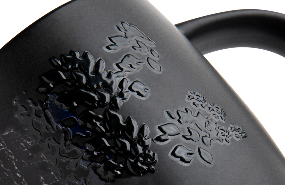 - grundfarve: hvid, blank (porcelæn), mat sort, mat grå (keramik)