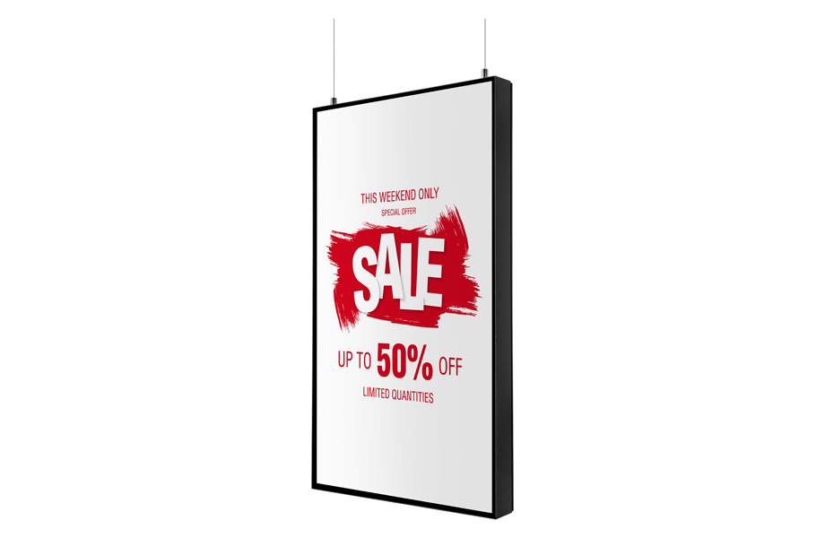 Il display digitale da appendere o da parete offre la massima flessibilità nella presentazione dei tuoi contenuti. Che sia montato a parete o sospeso al soffitto, questo display multimediale garantisce una presentazione professionale e di grande impatto visivo. Ideale per l'utilizzo nel punto vendita, in fiere o aree reception, dove lo spazio deve essere sfruttato in modo ottimale. Il display può essere utilizzato in modo versatile: per messaggi pubblicitari, video sui prodotti o informazioni importanti, sempre sotto gli occhi del tuo target di riferimento.