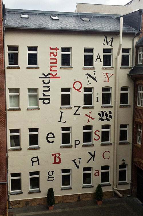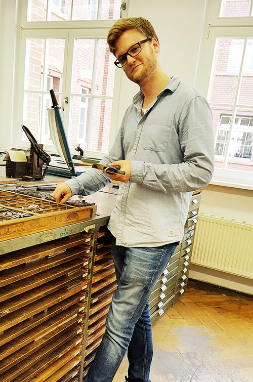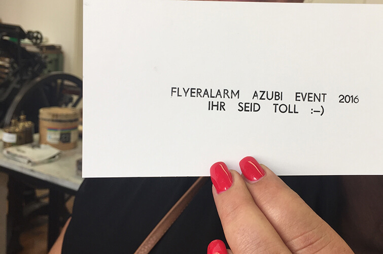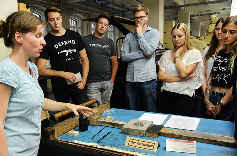 Angekommen, stärkten wir uns erst einmal mit einem ausgiebigen Mittagessen. Satt und glücklich ging es dann los mit der ersten Besichtigung. Unser Ziel: Das Druckkunstmuseum. Spannend! In zwei Gruppen aufgeteilt durchforsteten wir die verschiedenen Etappen und Meilensteine des Drucks. Angefangen vom Herstellen aufwendiger Lettern, bis hin zum Massendruckverfahren, erfuhren wir alles über die Geschichte des Drucks. Als Highlight des Tages durften wir uns während eines Workshops einen eigenen Schriftzug setzen und diesen im Anschluss drucken.