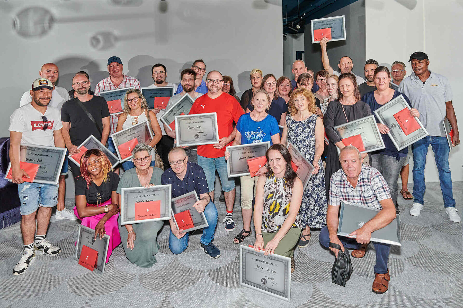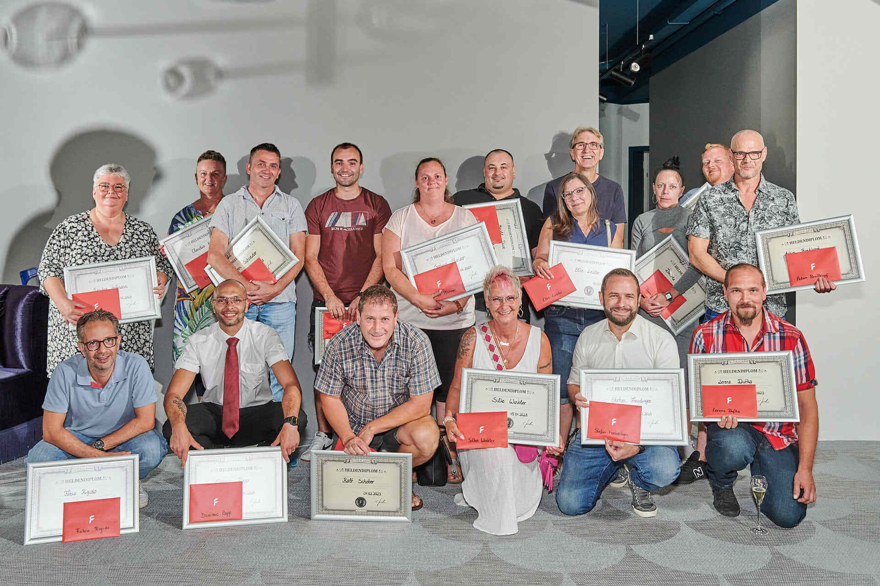 Die Geschäftsleitung überreicht feierlich Heldendiplome und Geschenke für den langjährigen Einsatz bei FLYERALARM. Die Anzahl unserer Jubilare ist beeindruckend: 40 Kolleginnen und Kollegen sind schon seit 10 Jahren bei uns, 23 Mitarbeitende seit 15 Jahren und ein Kollege sogar seit 20 Jahren!