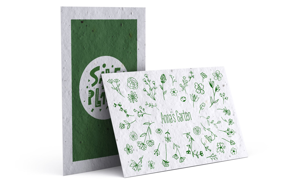 De här visitkorten av fröpapper lämnar ett bestående intryck – både i tankarna och i trädgården hos din målgrupp. Pappret består av återvunna bomullsrester och innehåller en blomsterblandning. Dina kunder behöver bara plantera visitkorten, vattna och titta på hur de färggranna blommorna börjar gro. På så sätt förknippas ditt varumärke med innovation och tillväxt – i ordets rätta bemärkelse.